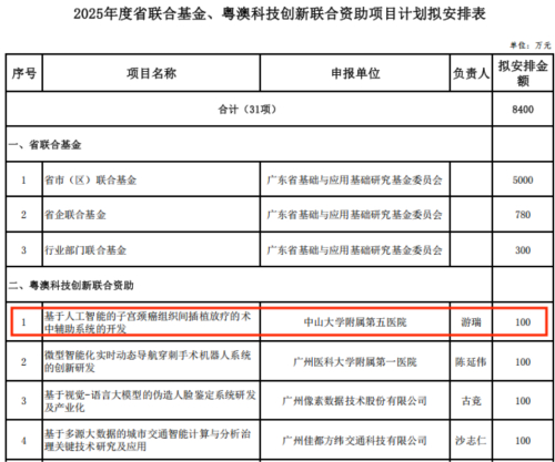 近日,我院放射肿瘤科游瑞主任团队牵头申报的“基于人工智能的子宫颈癌组织间插植放疗的术中辅助系统的开发”项目,获批2025年省科技创新战略专项资金(粤澳科技创新联合资助)100万元,联合珠海、澳门企业资助经费累计达300万元。