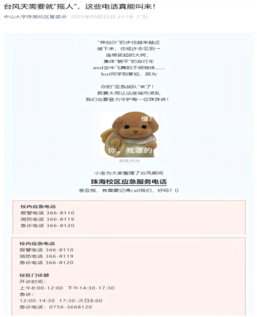 风雨见证担当,坚守诠释仁心。中山大学珠海校区门诊部的医护人员在台风期间的坚守,不仅确保了校园医疗服务的正常运行,更用他们的专业、勇敢和奉献,温暖了每一位在校师生的心,他们是狂风暴雨中最令人安心的“生命灯塔”。