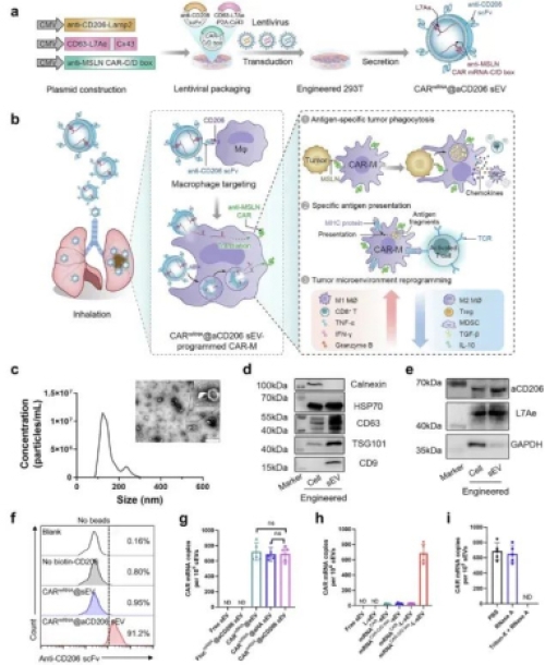 传统的CAR-M制造工艺复杂,且细胞通过静脉注射后大多滞留在肝脏,难以有效到达肺部病灶。针对这一难题,黄曦教授团队设计了一种巧妙的“原位改造”方案:他们成功构建了一种工程化的小细胞外囊泡(sEV),其表面整合了靶向巨噬细胞的抗体(抗CD206 scFv),内部装载了可编码识别肿瘤抗原间皮素的CAR结构的mRNA。